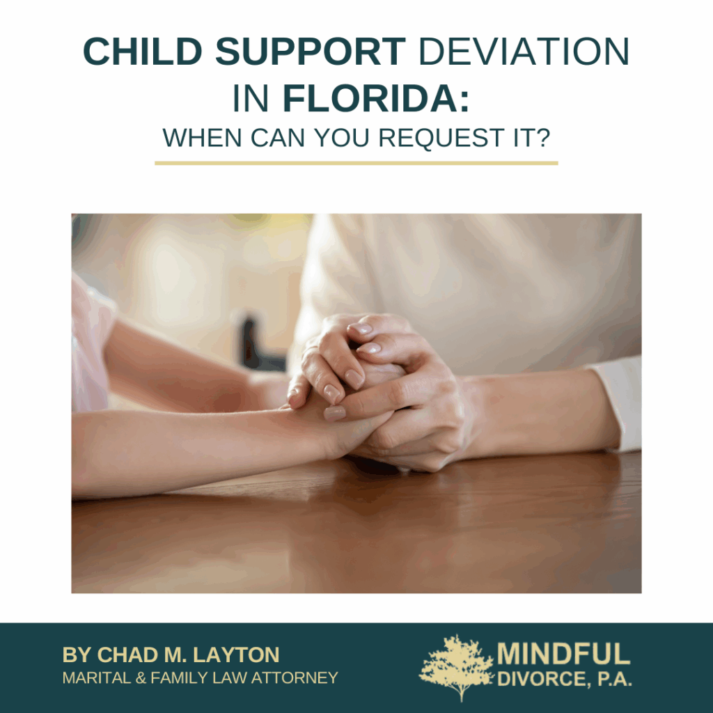 At Mindful Divorce, P.A., we offer transparent, fixed-fee services that keep your budget steady while you focus on your family. This article explains when a child support deviation can be requested in Florida, and it is for educational purposes only, not legal advice.